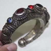 Bracelets traditionnels et manchettes Afghans Afghanistan en argent ethnique, lapis lazuli et pierres taillées, facettées gravées