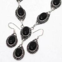 COL-056 - COLLIER + BOUCLES OREILLES GOTHIQUES argent 925 et cabochons en ONYX NOIR polis 10 x 15 mm - 170 carats - 34 gr