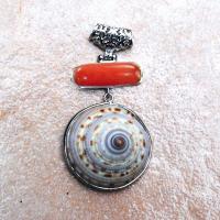 PEN-085 - Joli PENDENTIF PENDANT ethnique 65 mm en argent 925, CORAIL et COQUILLAGE - 75 carats - 15 gr