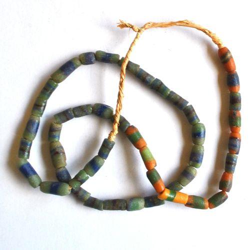 BJA-018 - COLLIER PARURE Africaine 65 cm 1 rang de 46 perles en pâtes de verre bleu / vert du GHANA 6 x 10 mm - 220 carats 44 gr