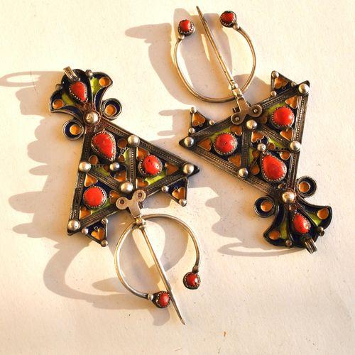 BBY-005 - Paire de 2 grandes FIBULES anciennes Kabyles BENI YENNI 8,5 x 16 cm en ARGENT émaillé bleu-jaune-vert et 12 Cabochons en CORAIL - 190 gr