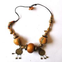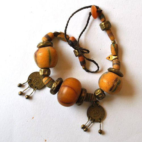 BJB-026 - Gros COLLIER Berbère Kabyle 50 cm 2 pendants pièces anciennes + Perles AMBRE et 2 perles pâte de verre - 640 carats 128 gr