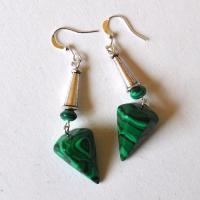BJE-068 - longue Paire de BOUCLES d'oreilles Egyptiennes 70 mm Pendants en poire 10 x 20 mm en MALACHITE verte et 2 perles coniques Argent 15 mm - 50 carats - 10 gr
