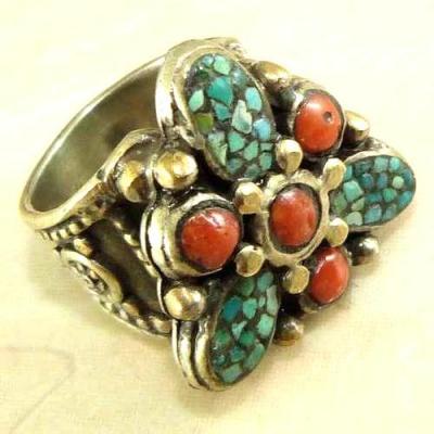 BAF-467 - Grosse Bague Ethnique Afghane Tibétaine Corail, Turquoise, T 58 - 115 carats 23 gr